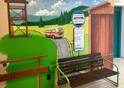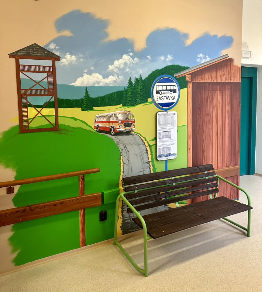 Jelikož se lidé s demencí v průběhu svého onemocnění vrací do různých období svého života, doplnili jsme oddělení také o zastávku. Často se stává, že se senioři ocitnou ve fázi života, kdy chodili ještě do práce. Mají tendenci odcházet a hledat zastávku, kde by počkali na autobus, aby mohli odjet do práce. To bylo důvodem, proč jsme se pustili do projektu „autobusová zastávka“. Nachází se v chodbě přízemí vily. Stává se tak bezpečnou alternativou pro seniory, kteří „čekají na autobus do práce“. K uskutečnění došlo díky vedoucí vily paní Kopecké a zaměstnankyni přímé péče paní Říhové. Krásnou malbu přijíždějícího autobusu nám na zeď vytvořil pan Pavel Koňařík.